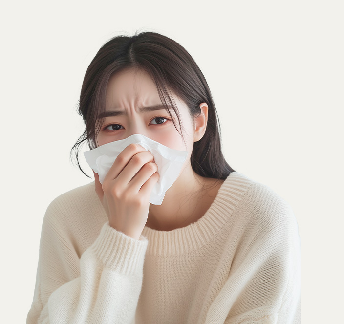 콧물, 코막힘, 재채기 등의 증상이 반복적으로 나타나 삶의 질을 떨어뜨립니다.